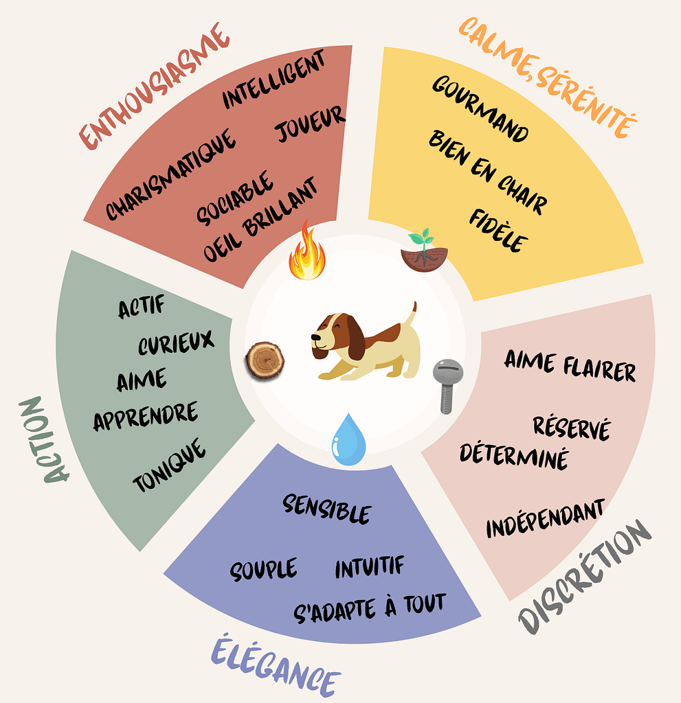 Les éléments correspondent chacun à une saison, une couleur un organe, un viscère, une émotion, une saveur*, etc.
